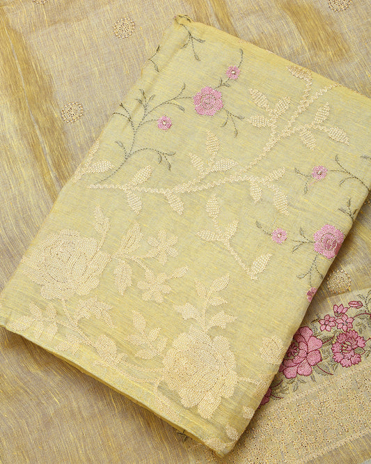 Butter Yellow Embroidered Linen Tissue Unstitched Dress Material Suit