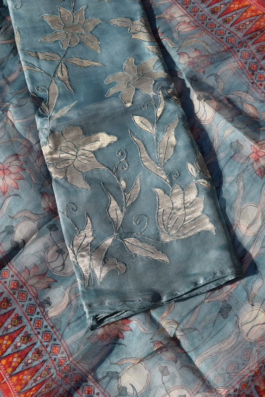 Teal Blue Mosaic Bloom Organza Unstitched Dress Material Suit
