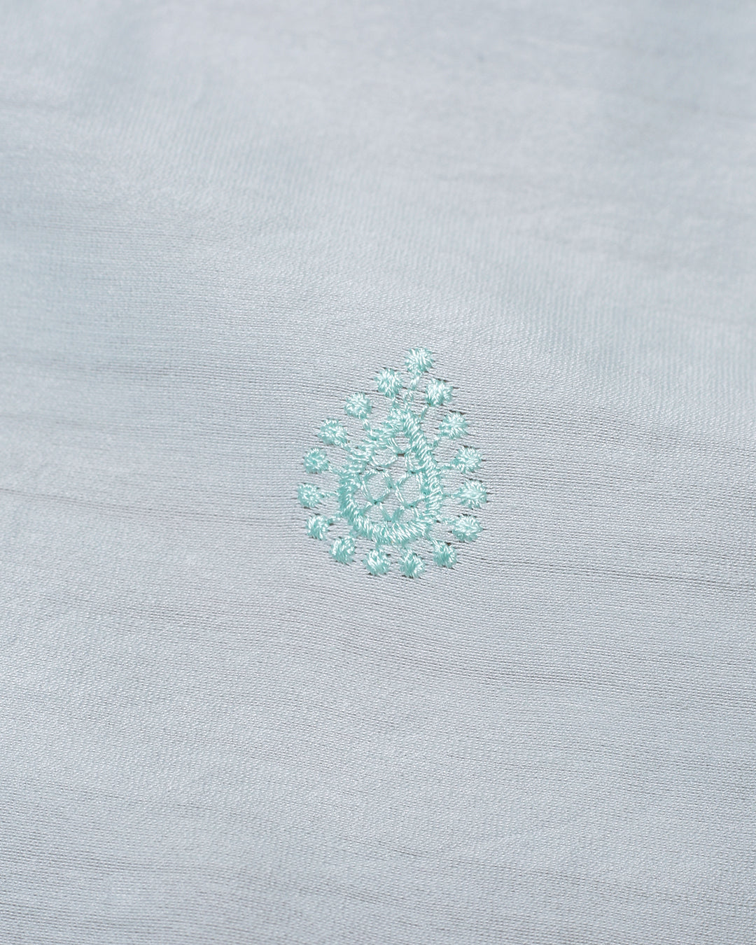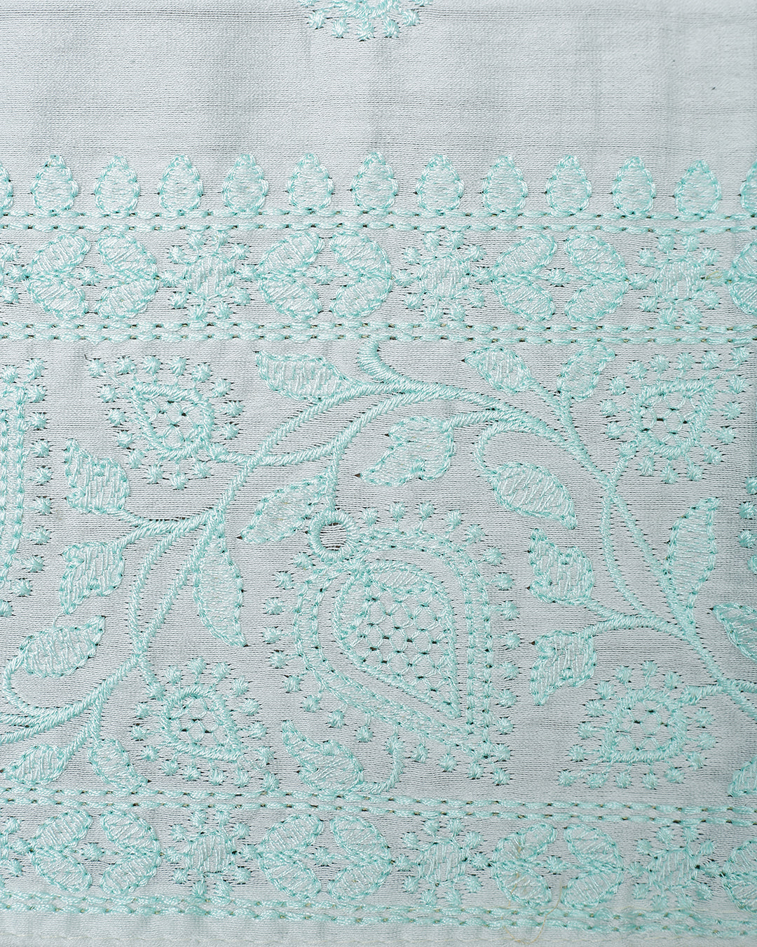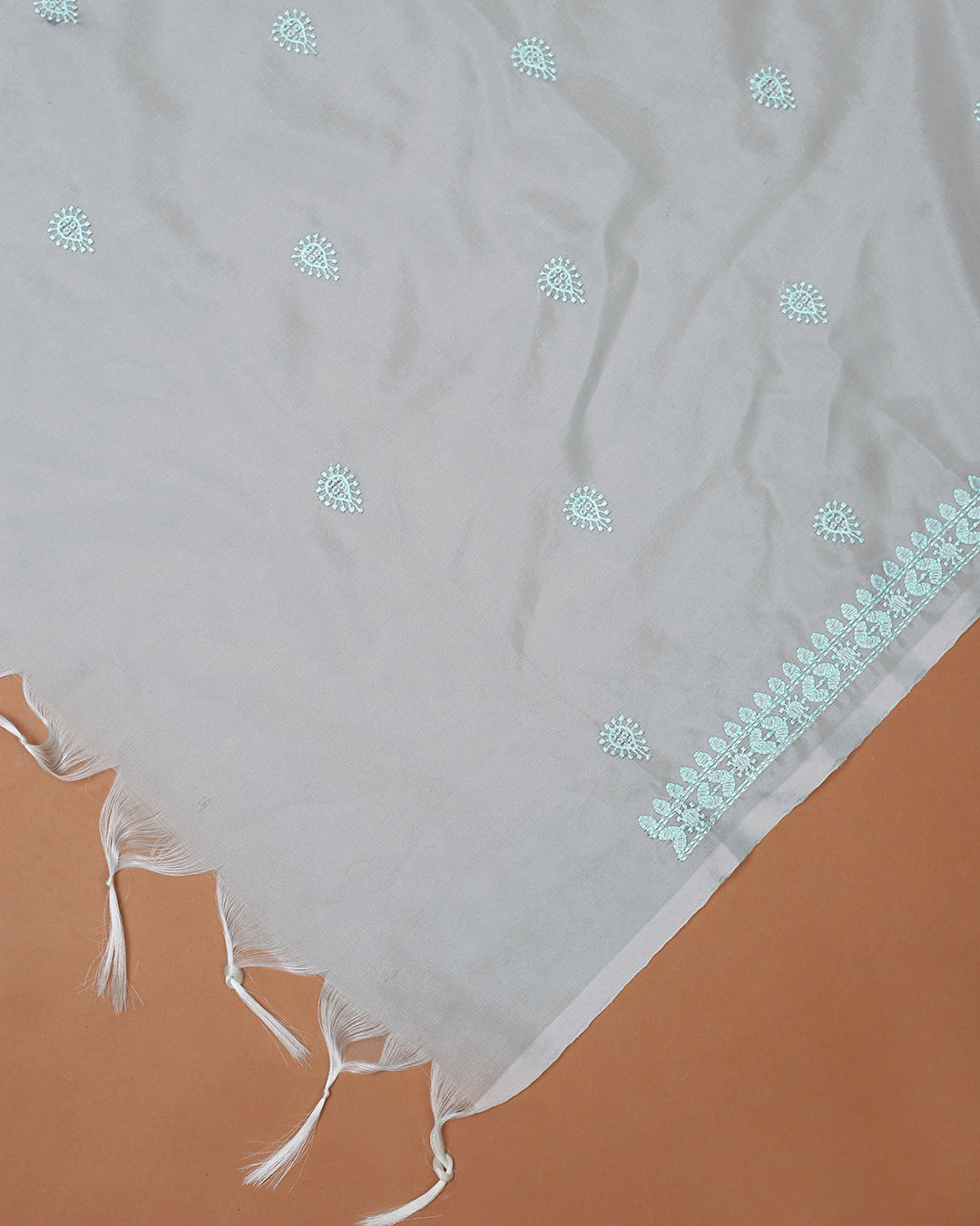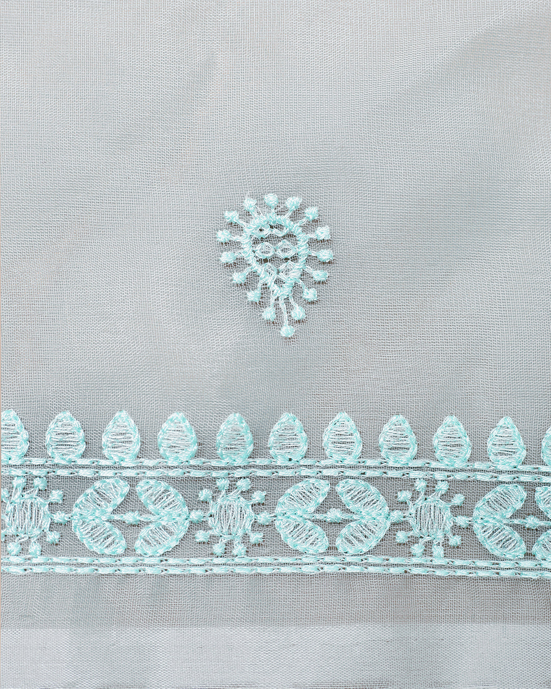 Embrace understated elegance with our Aqua Mist suit set. This unstitched ensemble features a soft, aqua-hued Chanderi cotton kurta, delicately embroidered with intricate floral and vine motifs in a matching thread. The set is completed by a sheer, coordinating organza dupatta, also embellished with delicate embroidery. Create a custom-tailored outfit that is both graceful and sophisticated