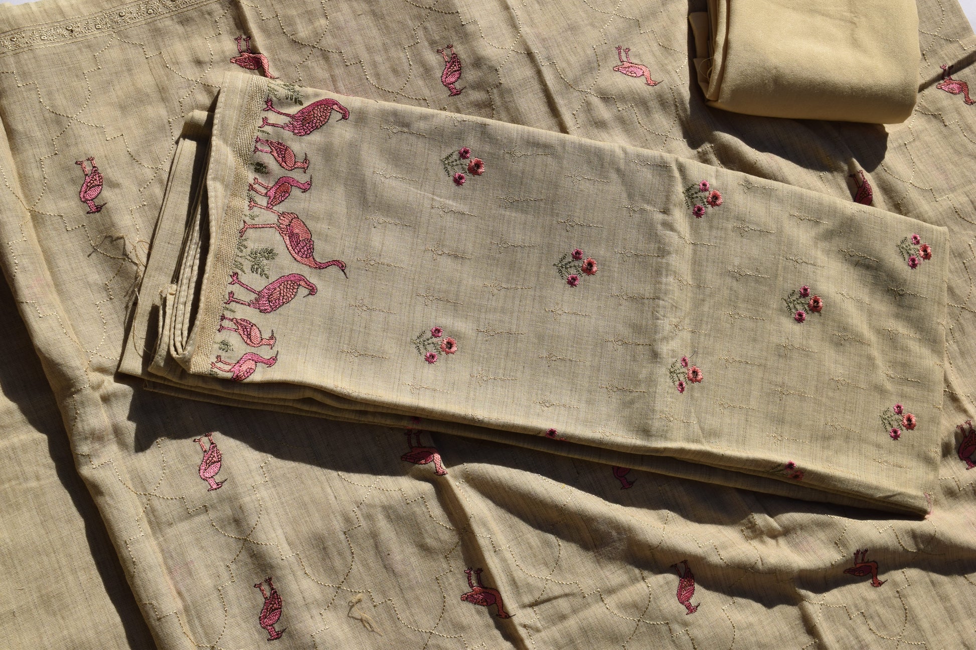 Beige Earthen Birdsong Khiccha Unstitched Dress Material Suit