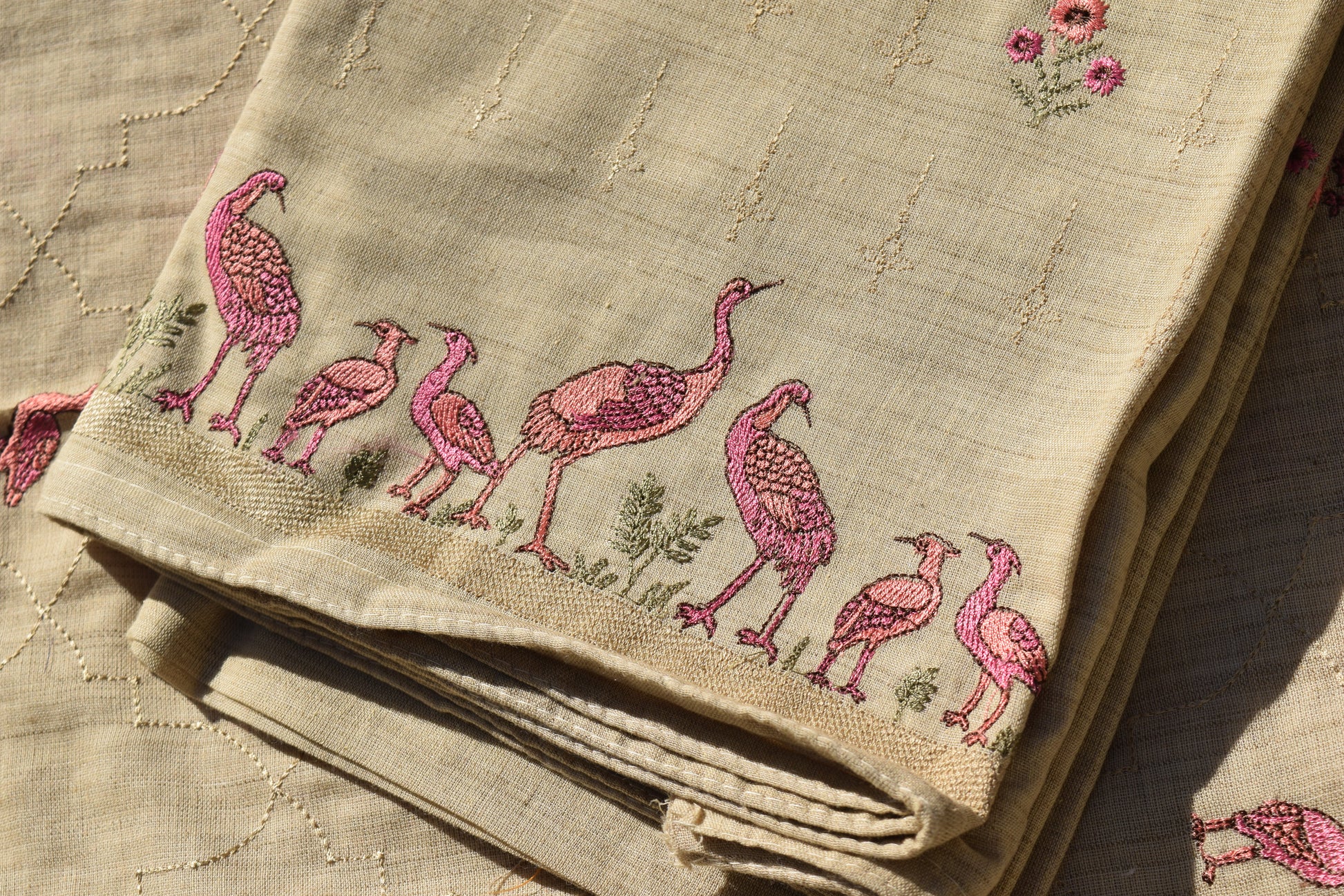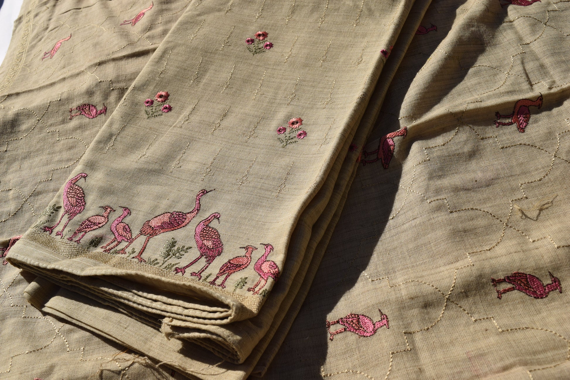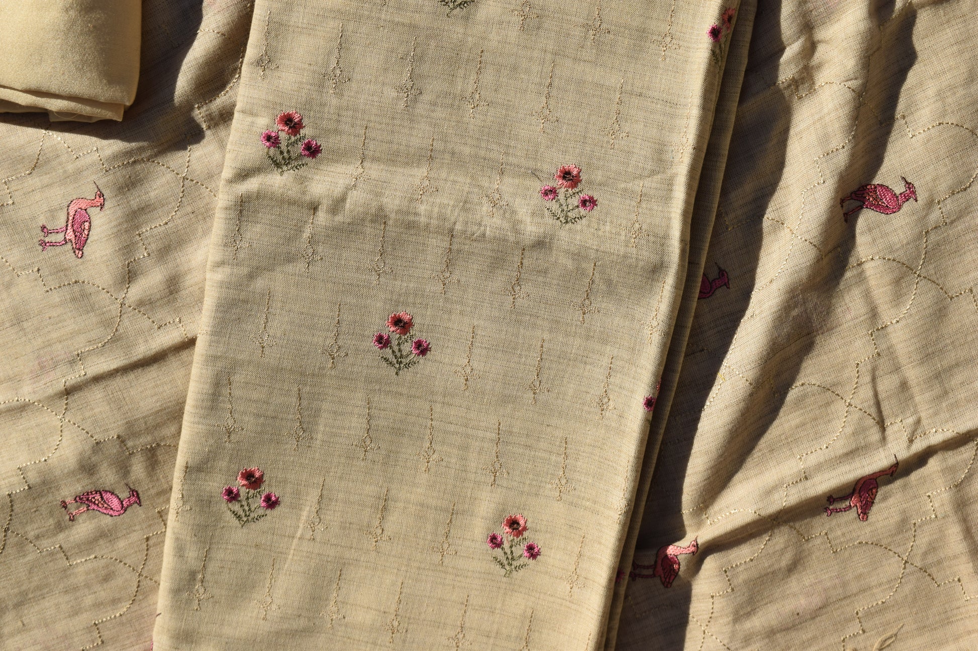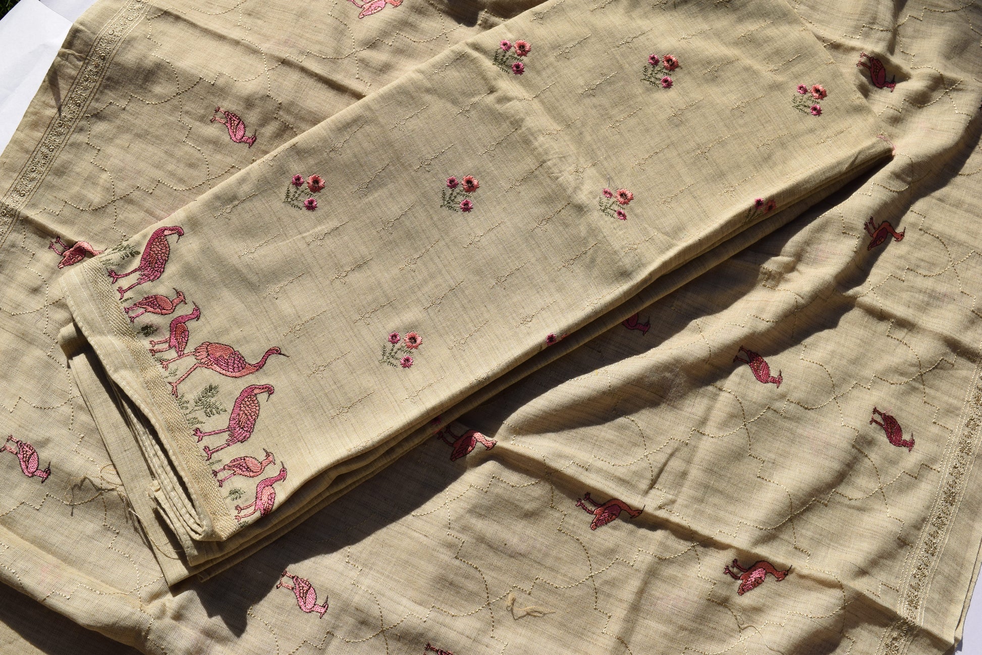 Embrace the rustic charm and sustainable style of our "Earthen Birdsong" suit set, crafted from exquisite Khiccha cotton. This ensemble features a natural beige or light taupe hue with a subtle greenish undertone, reminiscent of earthy tones. Delicate pink embroidered rosefinch motifs, along with small floral bootas, add a touch of whimsy and intricate detail. This set includes a matching dupatta and fabric for the bottom, offering versatility in styling. Perfect for casual outings, daytime events, or adding a touch of natural elegance to your wardrobe. Experience the unique blend of comfort, artistry, and eco-conscious fashion with this beautiful Khiccha cotton creation.