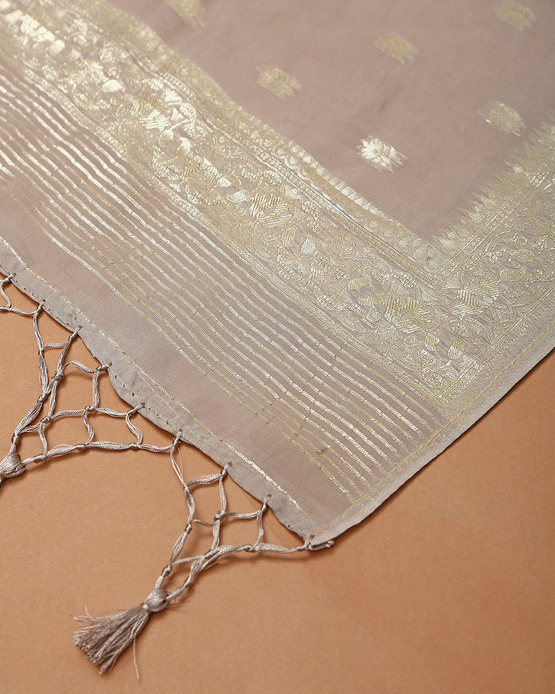 Embrace timeless elegance with this unstitched Banarasi Georgette suit set. The soft beige fabric features a delicate, all-over woven design with subtle gold zari accents. The highlight is the stunning, wide gold zari border, adding a touch of opulence. The set includes fabric for a kurta, bottom, and a matching Georgette dupatta, allowing you to create a custom-tailored ensemble perfect for special occasions
