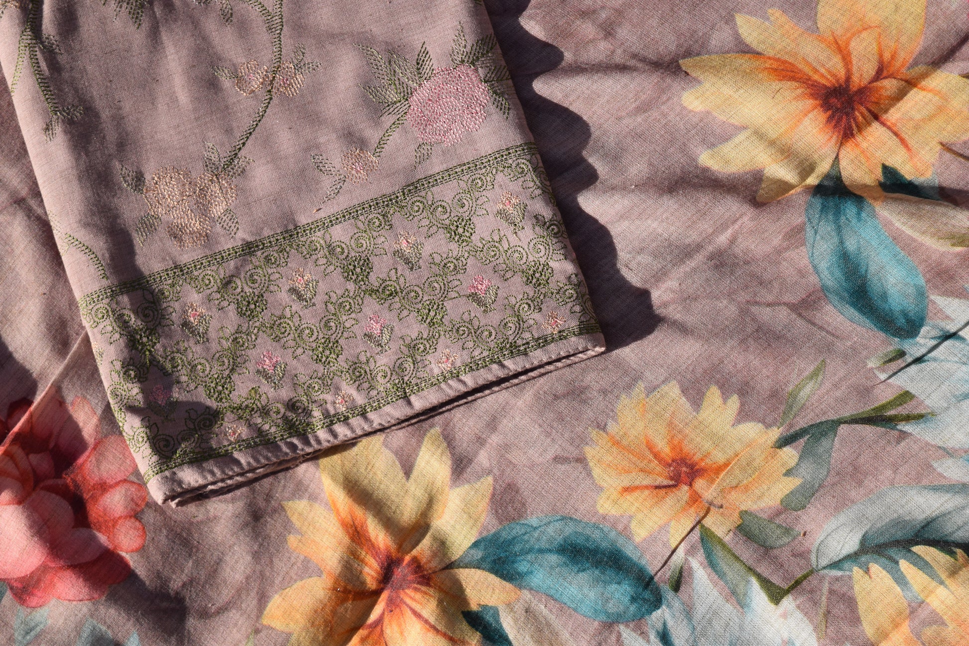 This unstitched Khiccha cotton suit set features a delicate dusty rose hue, reminiscent of a vintage garden. The soft cotton fabric is adorned with a vibrant floral print in shades of teal, yellow, and coral, creating a beautiful contrast. The subtle texture of Khiccha cotton adds depth and a touch of rustic charm. Includes fabric for a kurta (top), bottom, and a coordinating dupatta (scarf) panel with complementary floral detailing.