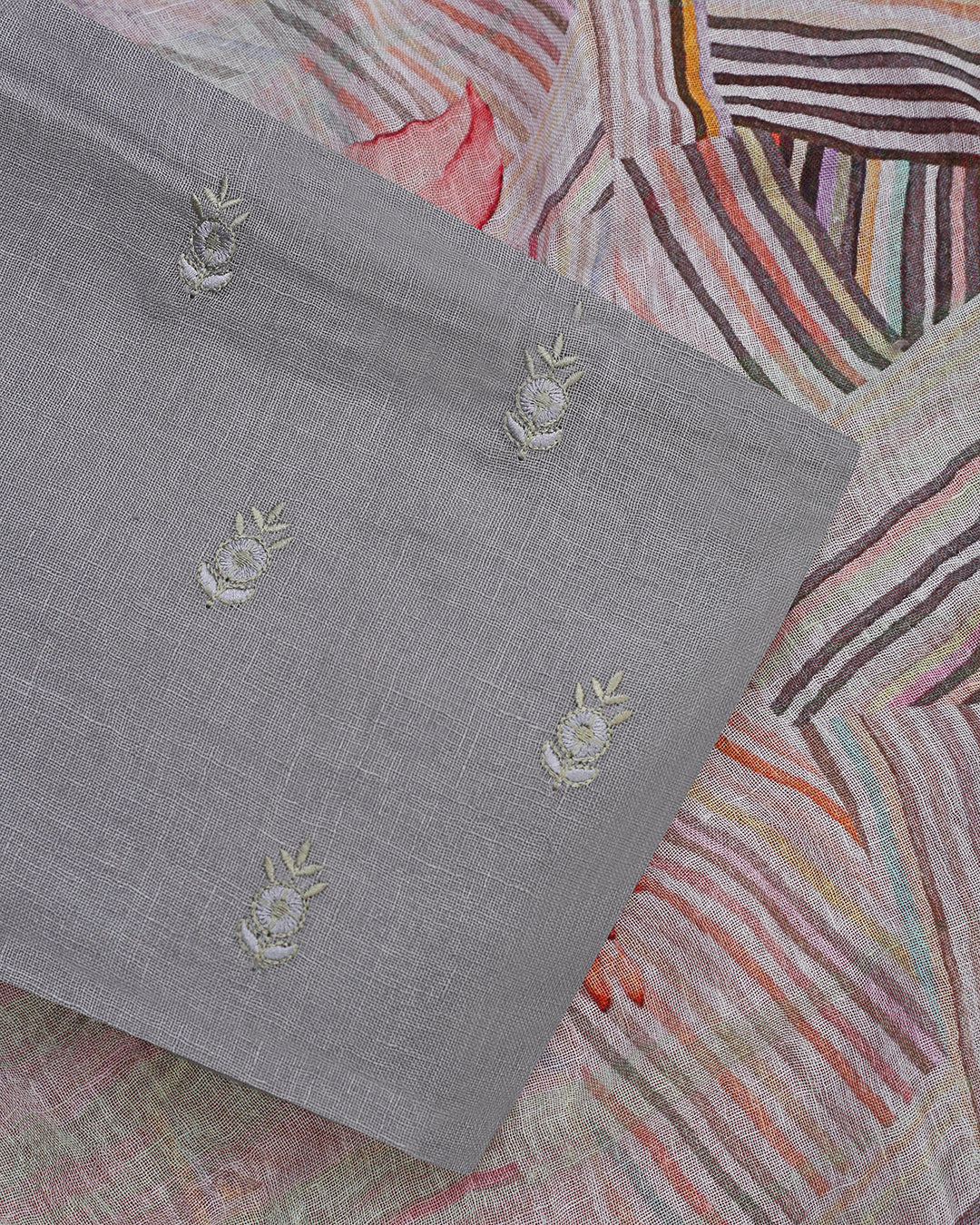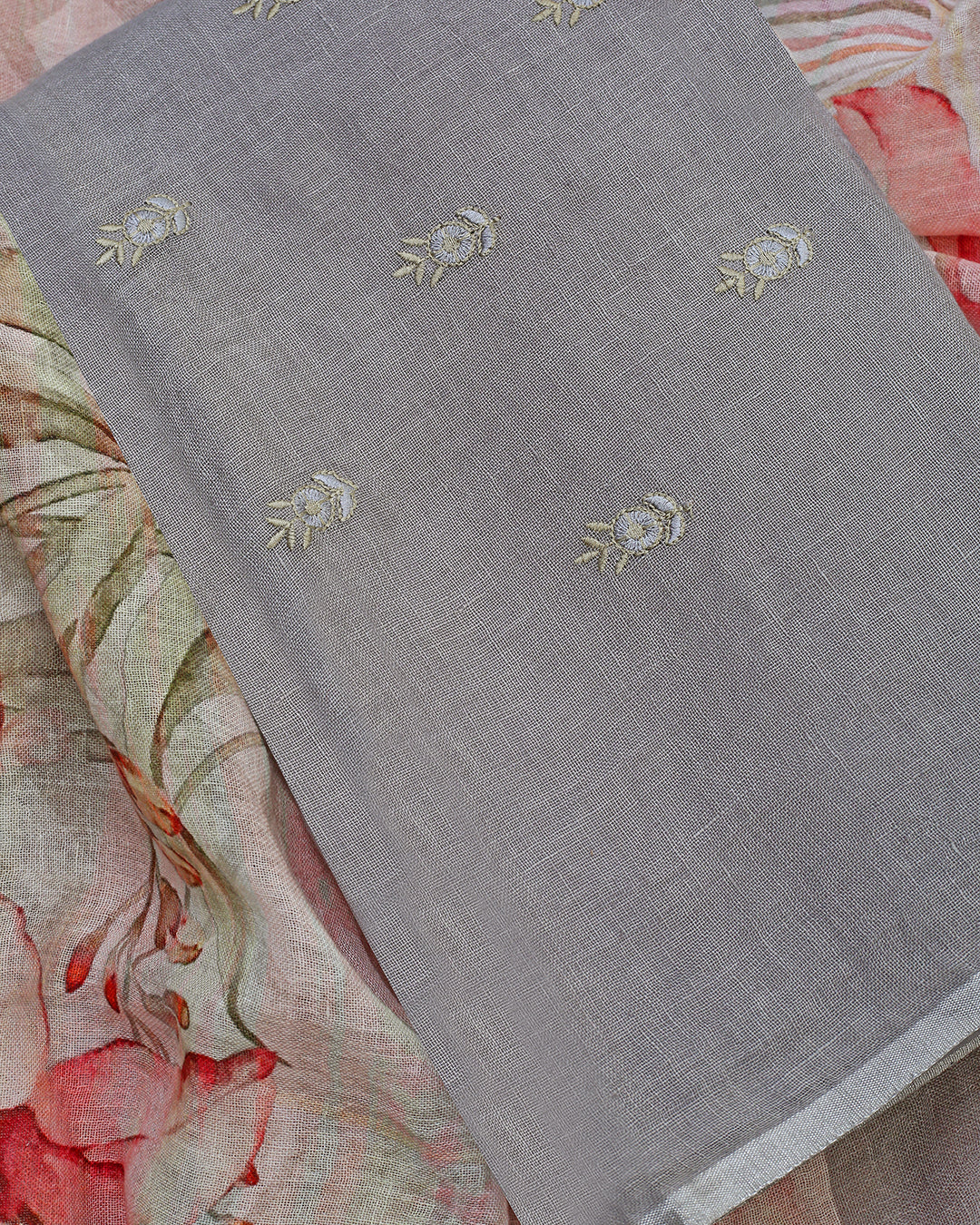 Gulmohar Grey and Red Linen Unstitched Dress Material Suit
