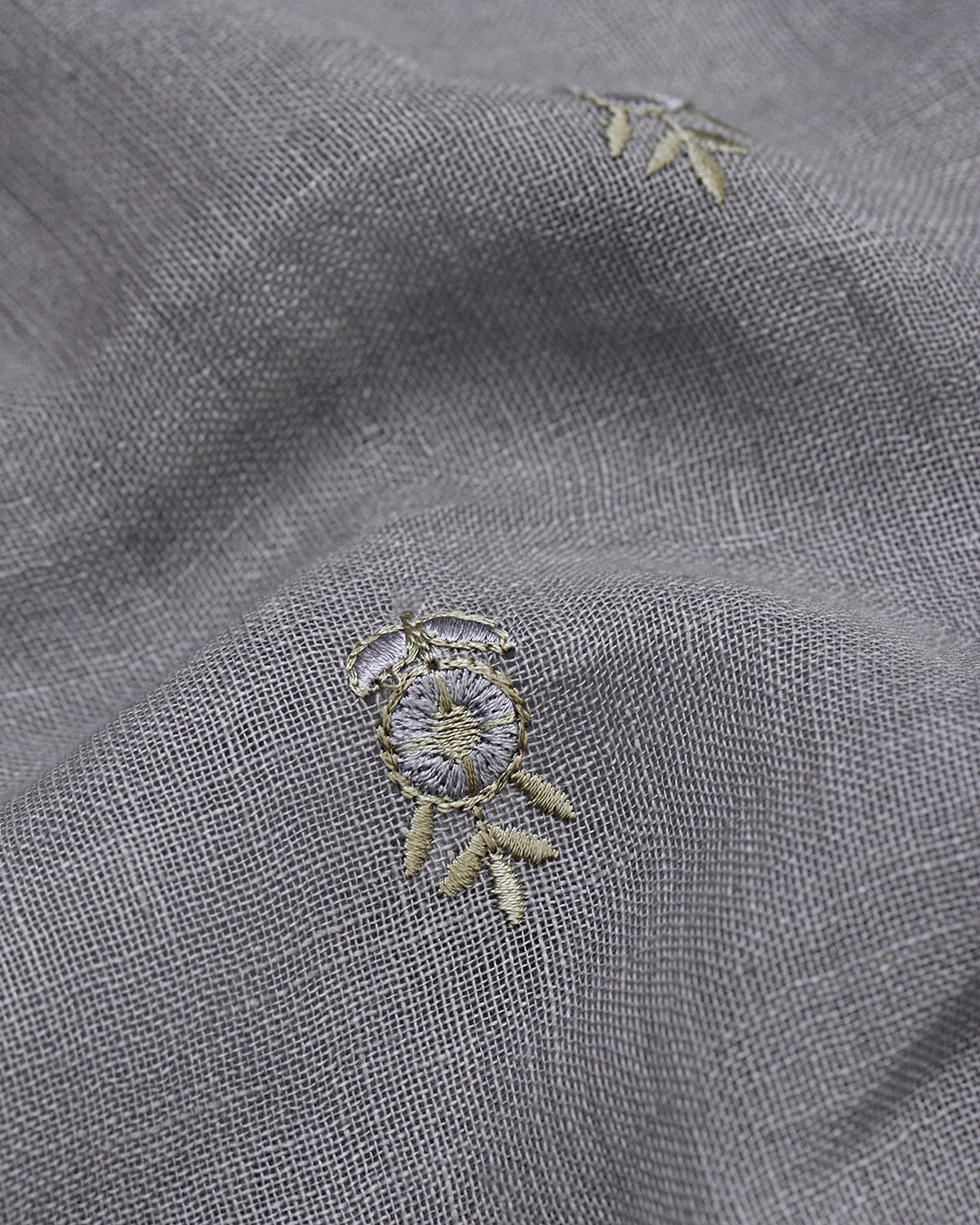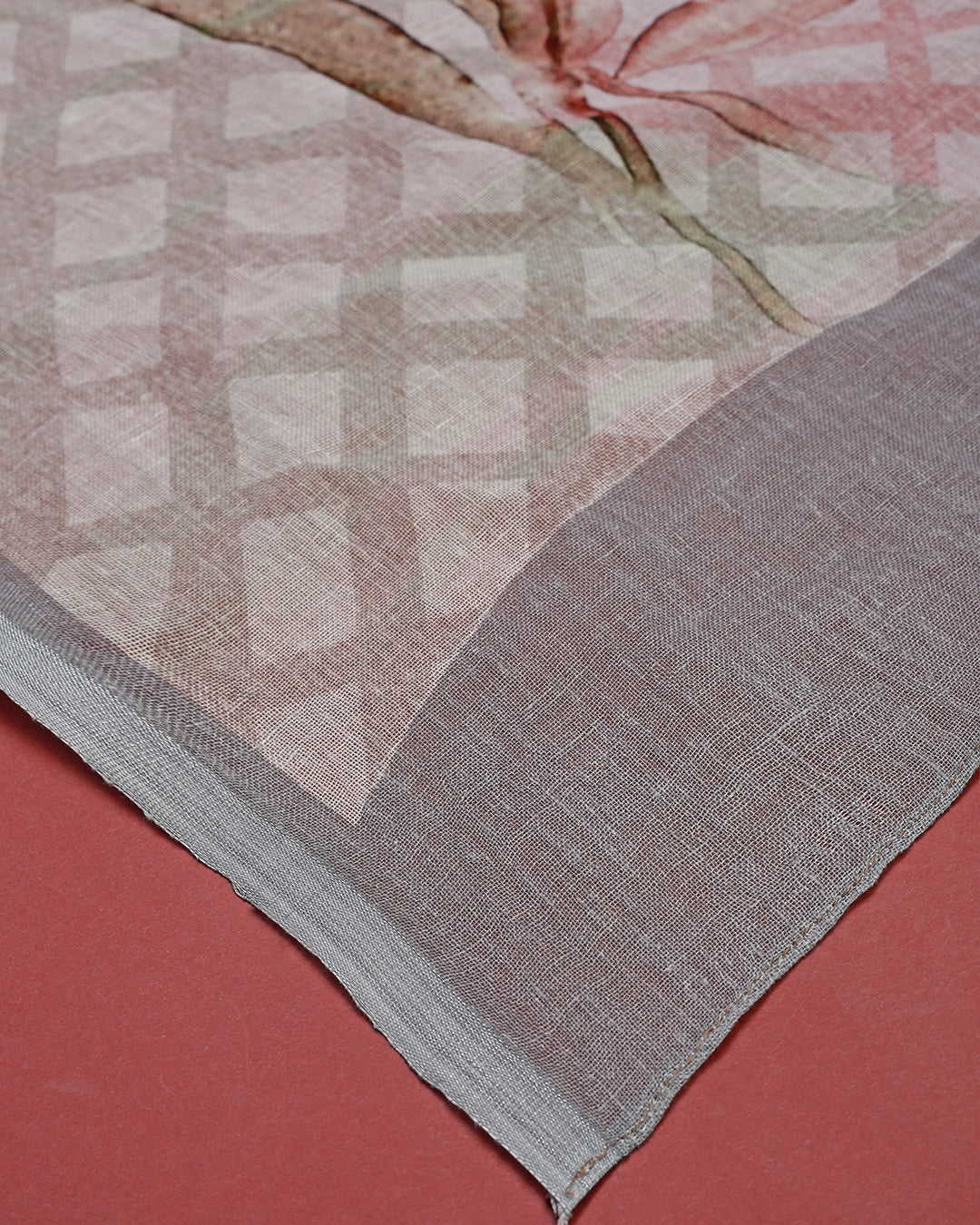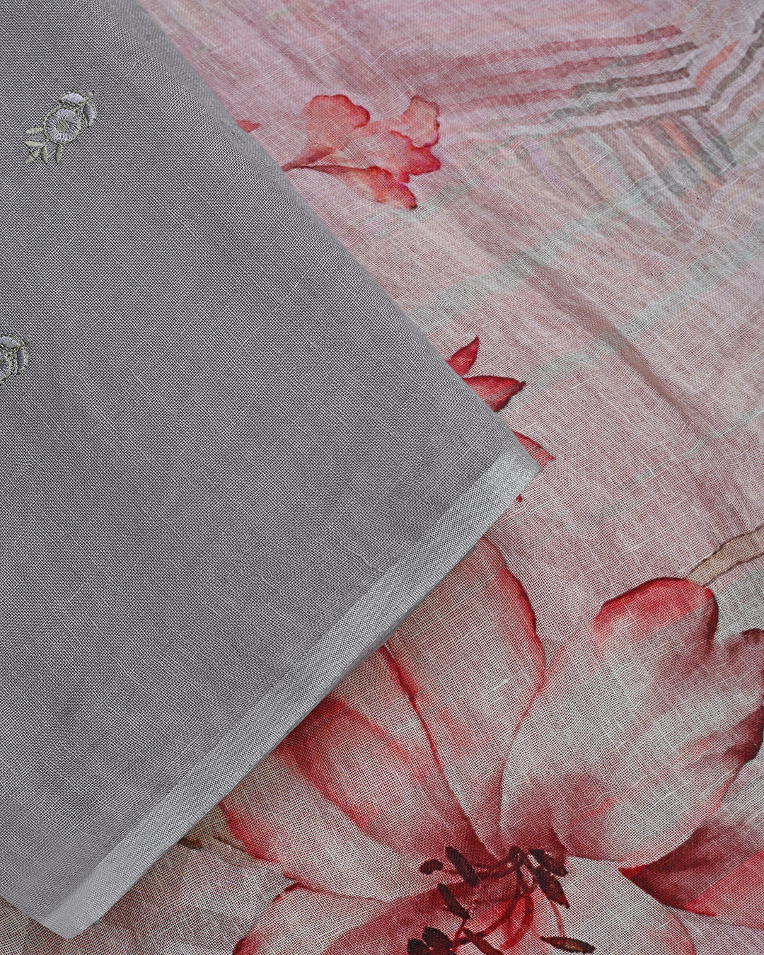 This unstitched linen suit set makes a statement with its vibrant, floral-printed dupatta. The kurta and bottom fabric are a solid, grey, providing a sophisticated contrast to the large-scale floral design in shades of pink and red. A perfect blend of classic and contemporary style.