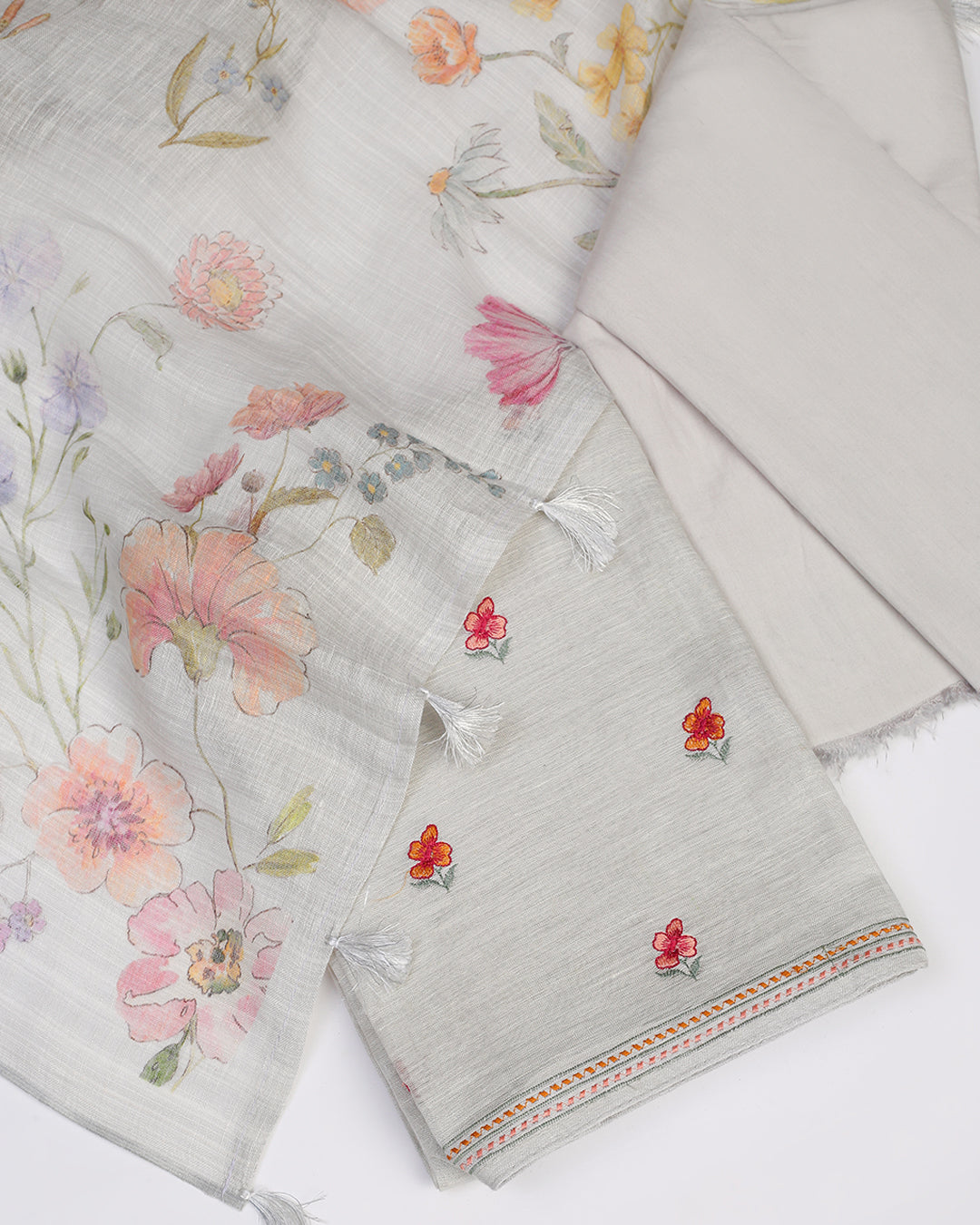 Craft your own elegant ensemble with this unstitched linen suit set. The set features a soft, pale grey linen fabric adorned with delicate, scattered floral embroidery in shades of pink and orange. The accompanying dupatt boasts a beautiful, larger-scale floral print in complementary colors, creating a harmonious and sophisticated look. This breathable linen fabric is perfect for warmer weather and offers a comfortable drape. Includes fabric for a kurta (top), bottom, and the printed dupatta. Customize the fit and style to your exact preferences.