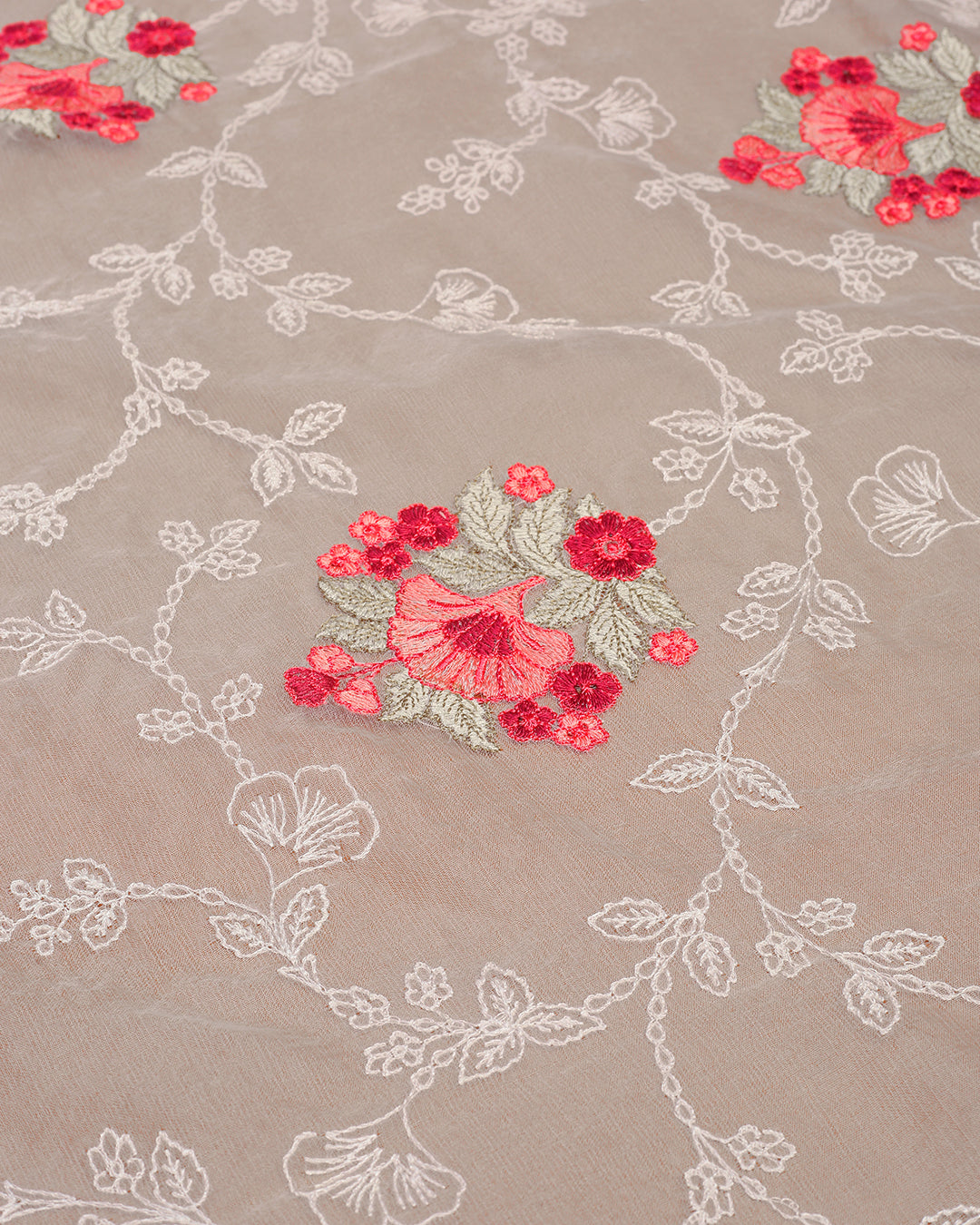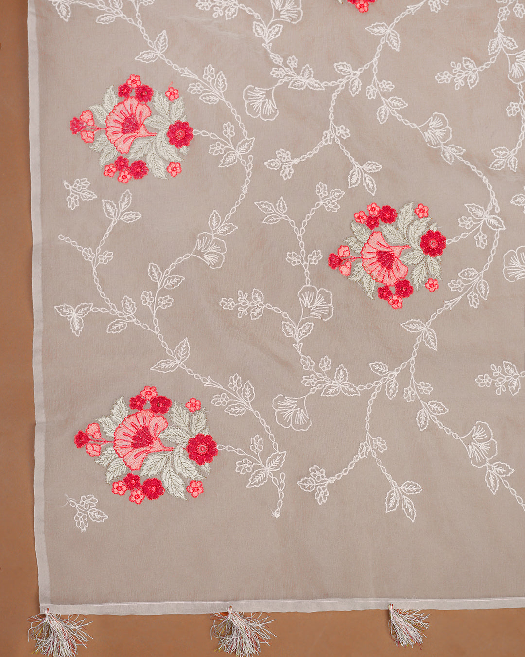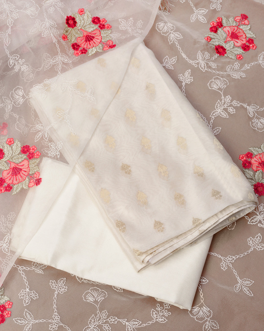 his unstitched suit set combines the luxurious drape of Chanderi silk with the ethereal beauty of embroidered organza. The ivory Chanderi silk top features a delicate, all-over woven gold zari pattern. The sheer ivory organza dupatta is the highlight, adorned with vibrant pink floral embroidery and intricate vine details. A plain ivory fabric is included for the bottom. Design your dream outfit with this exquisite material.