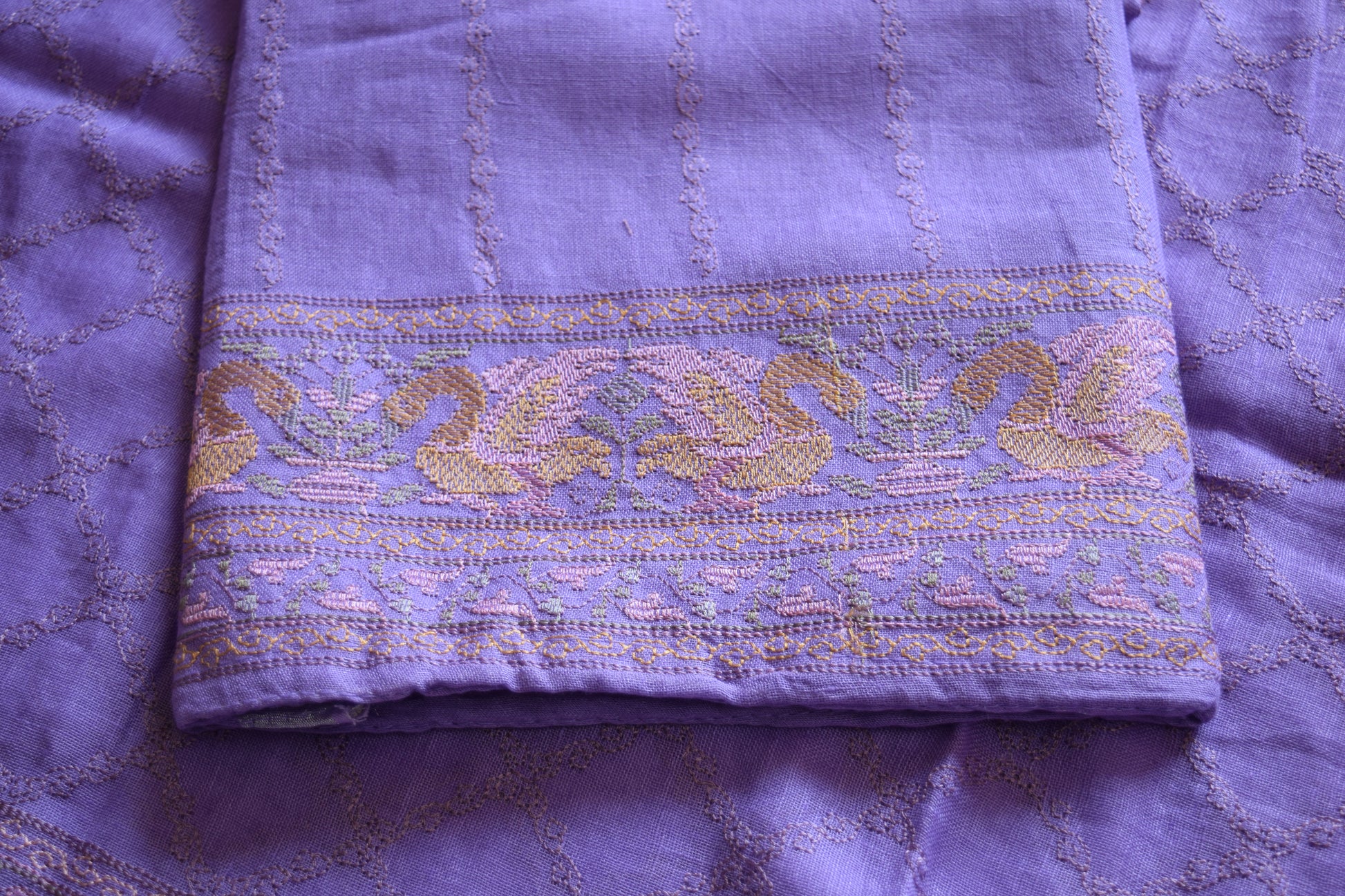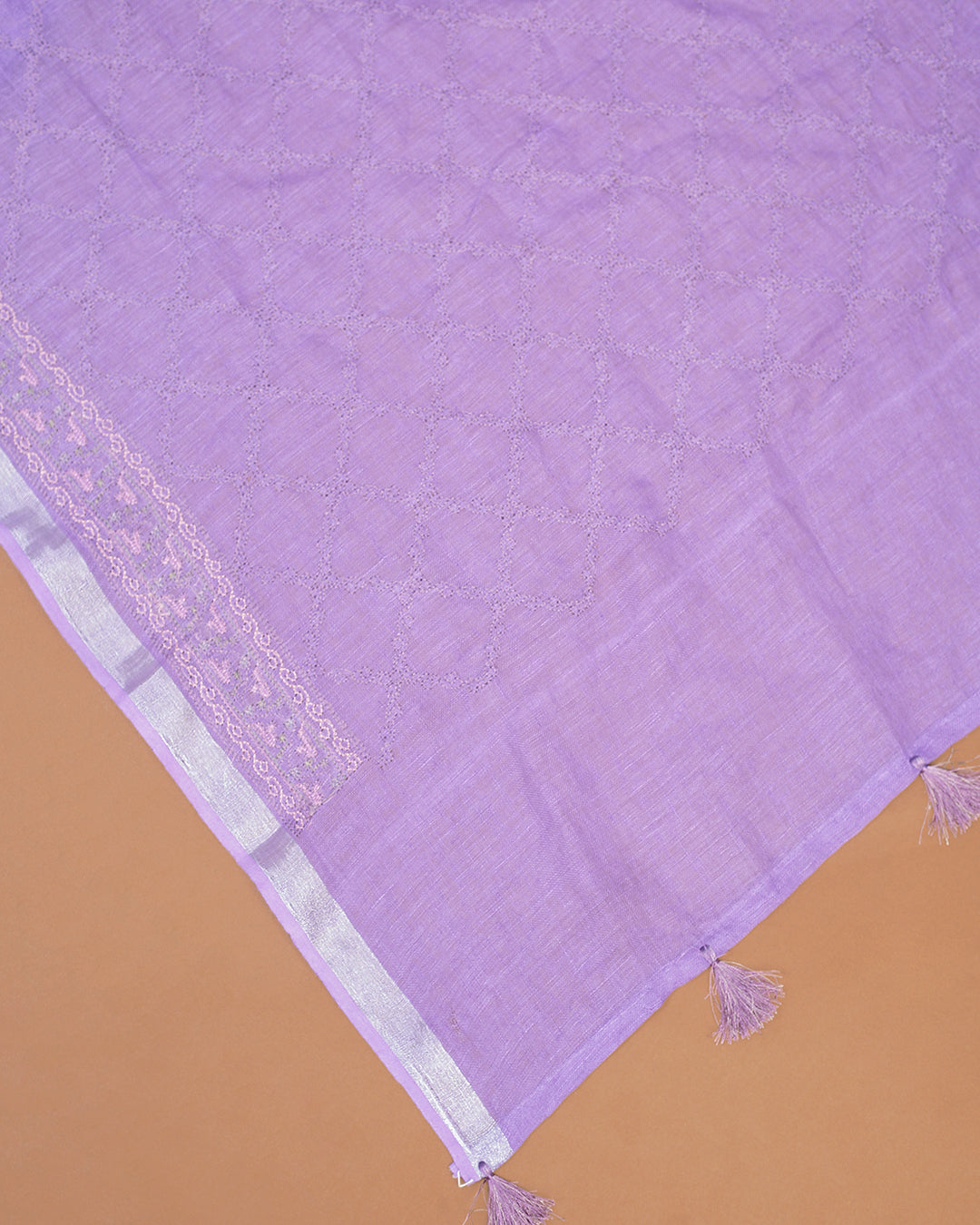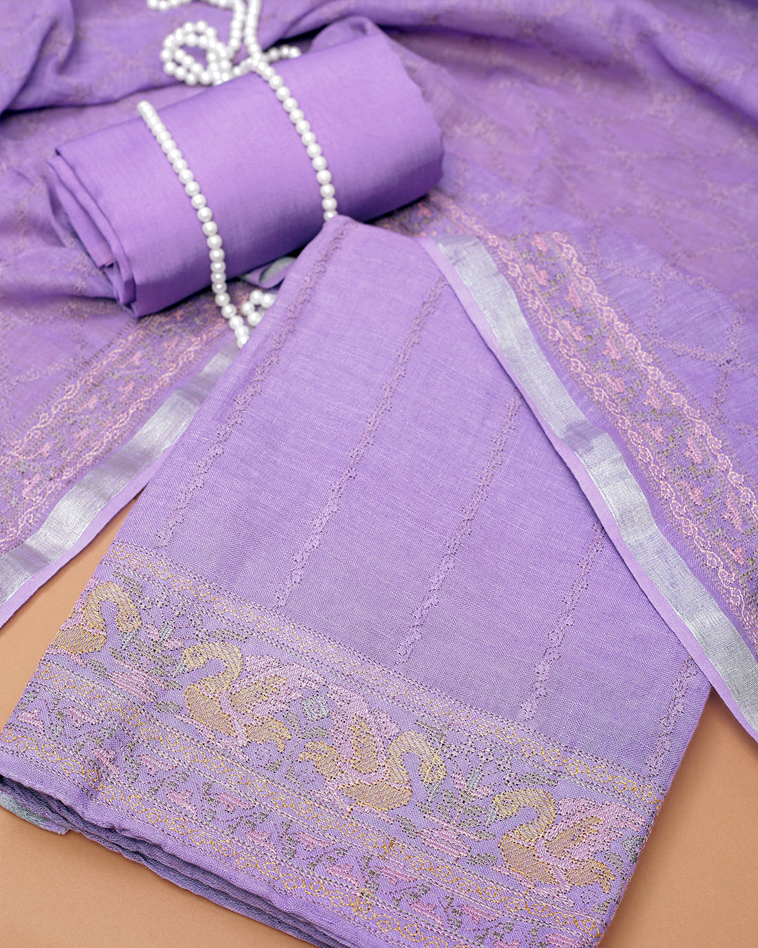 Embrace the beauty of simplicity with this lavender-purple linen unstitched suit set. The soft, breathable fabric is enhanced by a delicate self-pattern. The standout feature is the exquisite Zari border on the dupatta, showcasing intricate traditional motifs. Perfect for creating a graceful kurta, bottom, and dupatta combination.