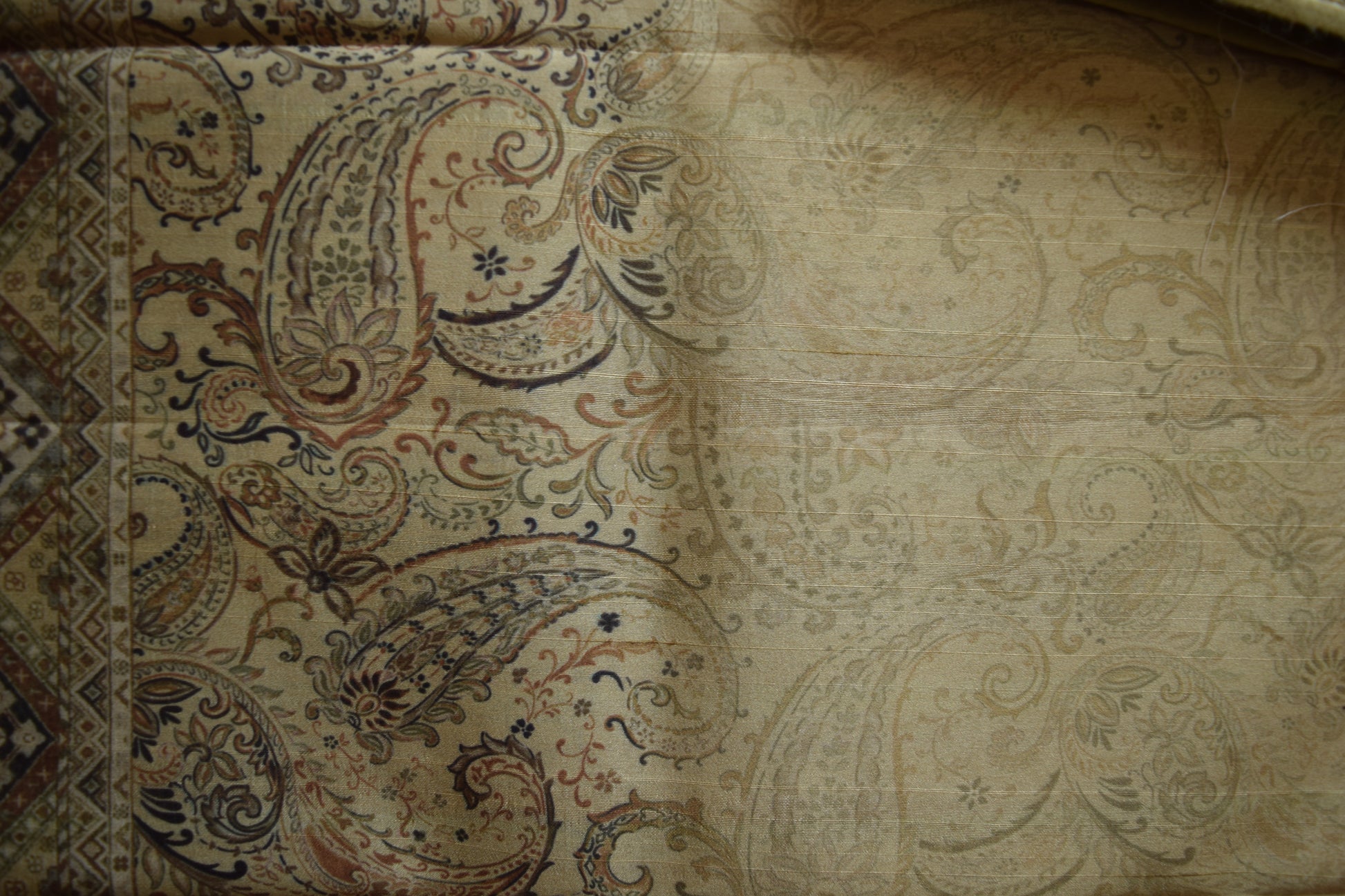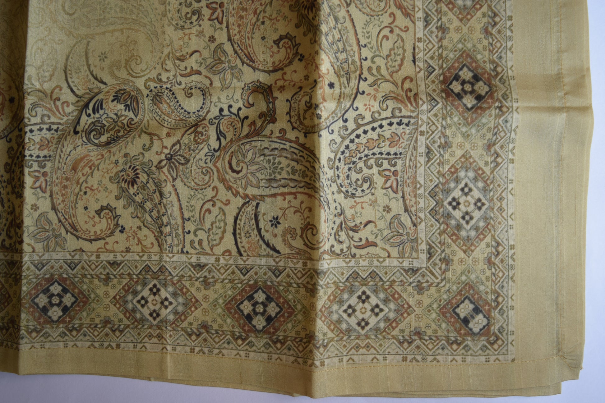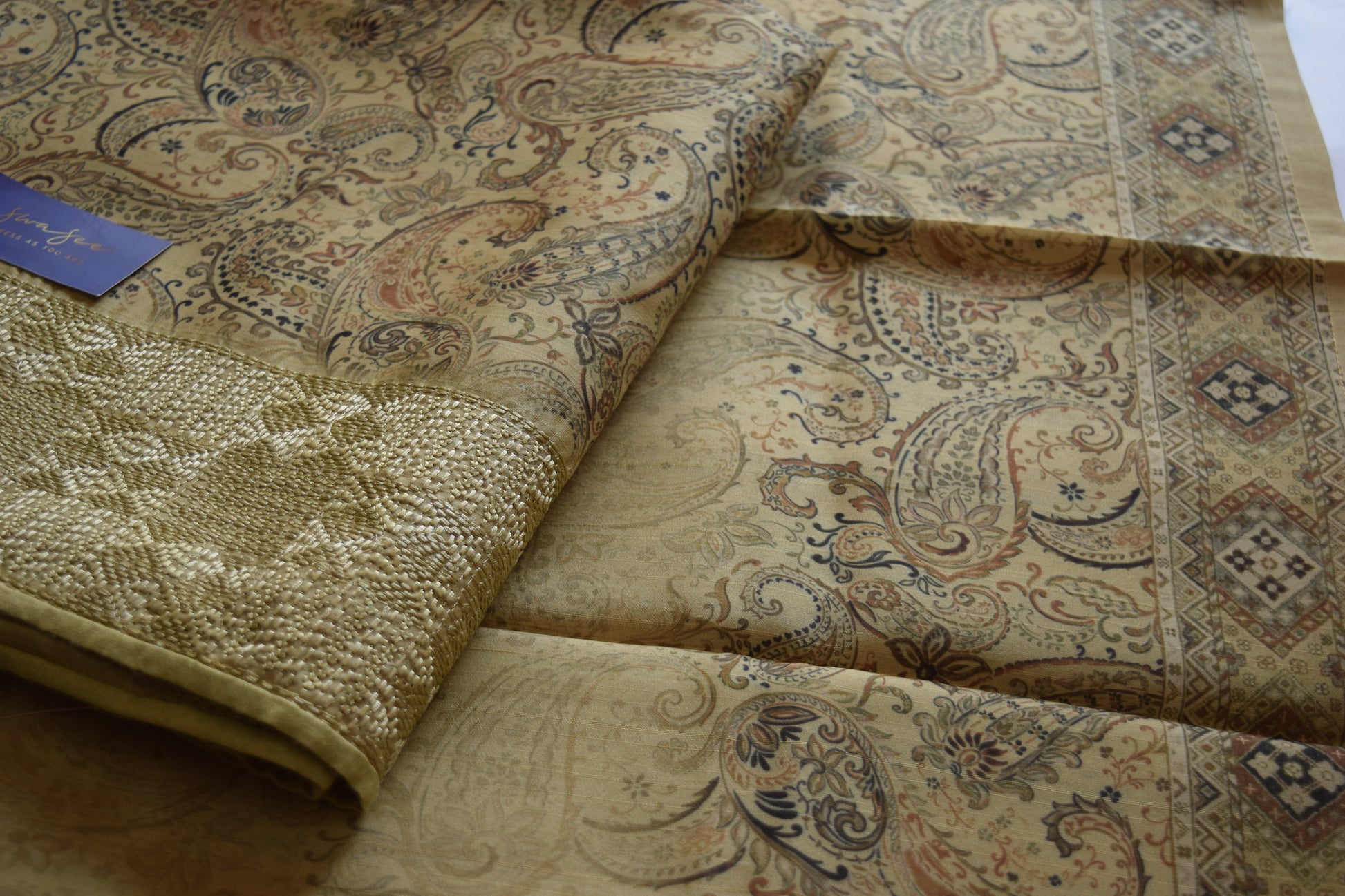 Experience the soft drape and subtle sheen of Chanderi silk with this 'Olive Mist' unstitched suit set. The light olive green fabric is adorned with a delicate paisley print, creating a sophisticated and understated look. The set includes a matching dupatta with a refined border and plain fabric for the bottoms. Ideal for creating a graceful and elegant ensemble.