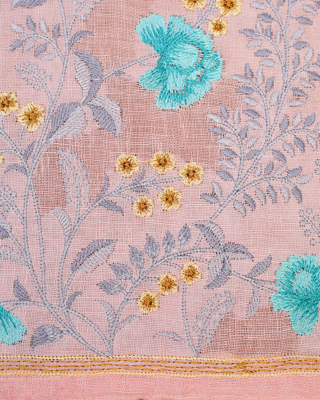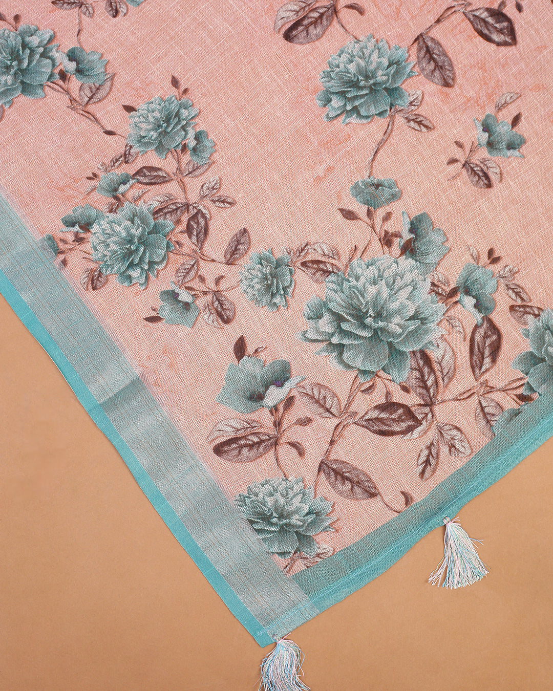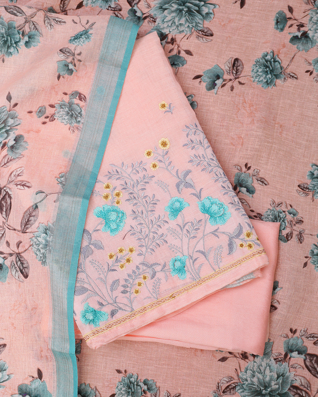 This unstitched linen suit set includes a peach kurta fabric with teal, grey, and yellow floral embroidery, a matching peach fabric for the bottom, and a linen dupatta with an all-over floral print and a teal border. The lightweight linen fabric and vibrant design make this set perfect for warm weather and special events