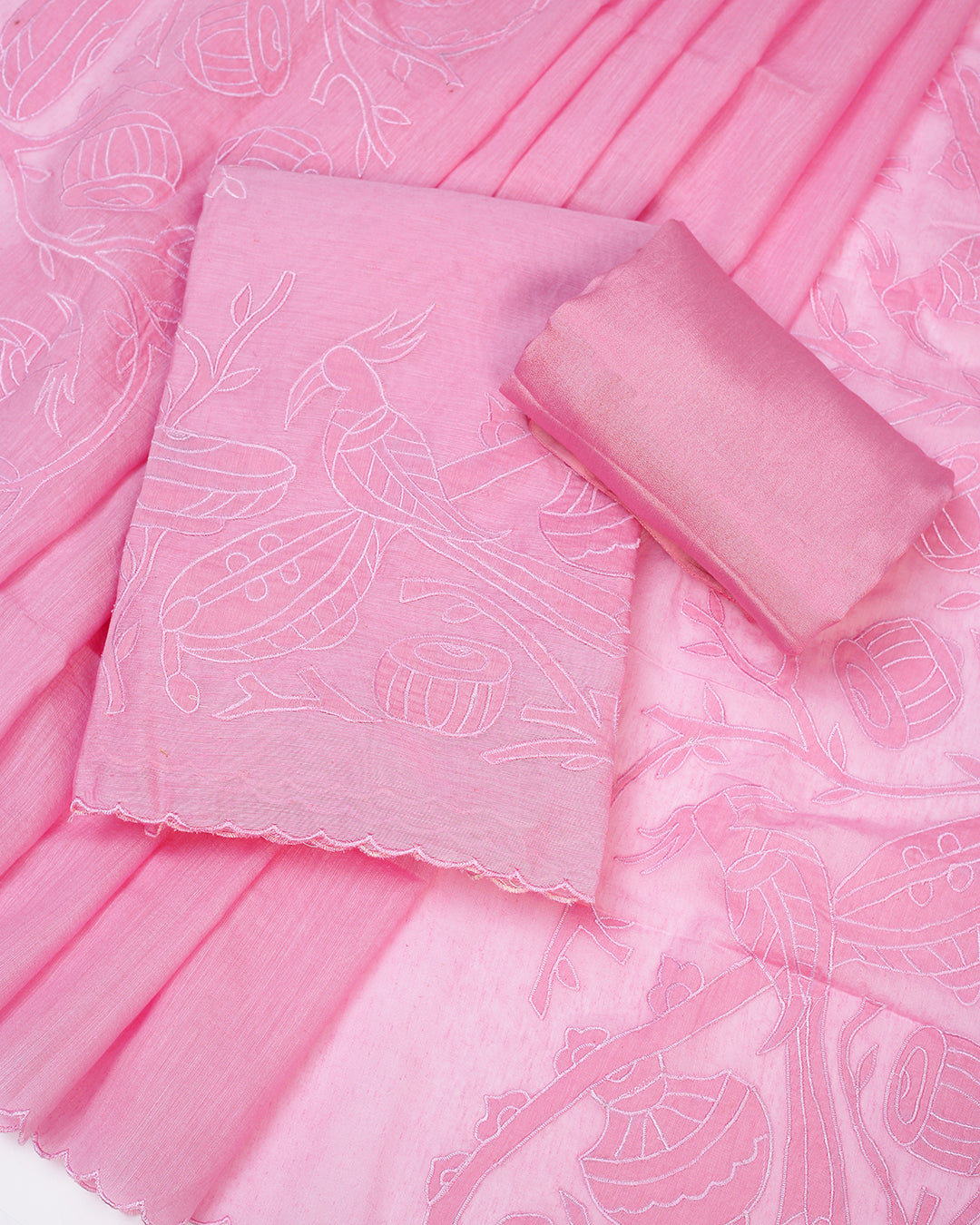 Indulge in the exquisite luxury of our "Pink Peacock Chanderi Silk Dream" suit set. This ensemble is crafted from the finest Chanderi Silk fabric, known for its lightweight breathability and delicate texture. The soft, pastel pink hue complements the intricate tonal embroidery, showcasing a graceful peacock amidst blooming flowers. This set includes a matching Chanderi Silk dupatta and fabric for the bottom, allowing you to customize your look. Perfect for warm weather occasions, festivals, or adding a touch of regal charm to your everyday style. Experience the perfect blend of comfort, artistry, and heritage with this stunning creation.