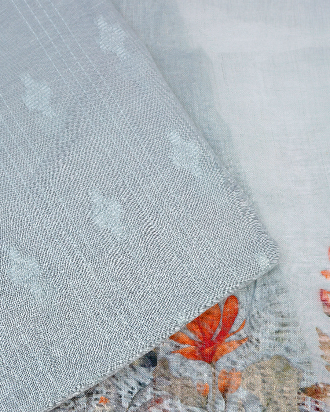 This unstitched suit set is crafted from soft, breathable linen in a delicate powder blue hue. The fabric features a graceful floral print in shades of peach, rust, and muted greens, lending a touch of vintage charm. The included bottom fabric is a solid, coordinating powder blue with subtle self-woven motifs. Perfect for creating a comfortable and elegant summer ensemble.