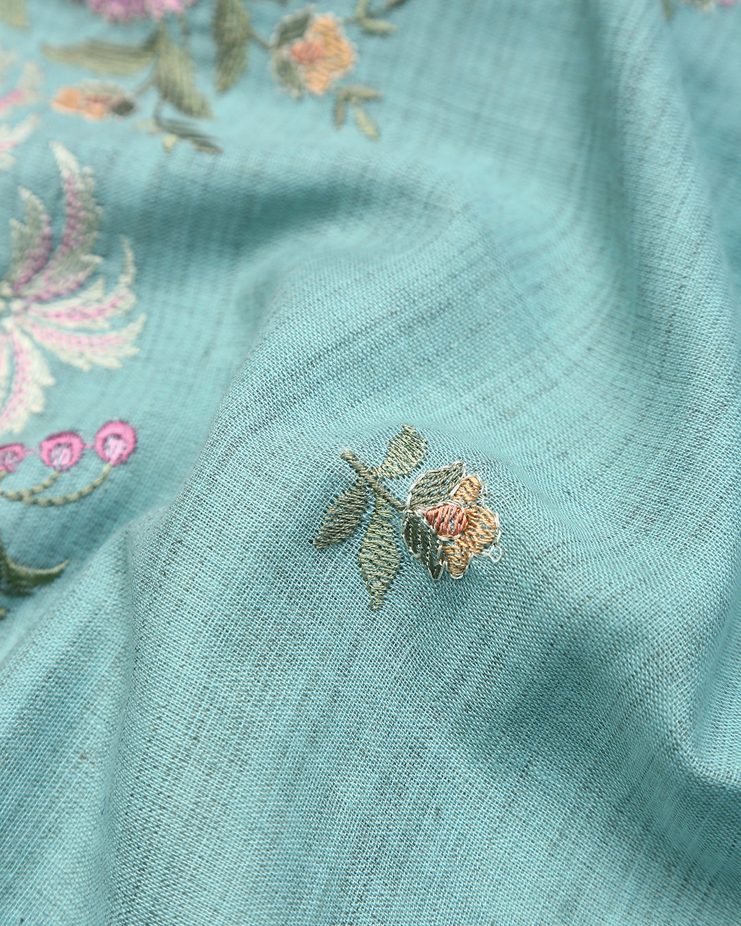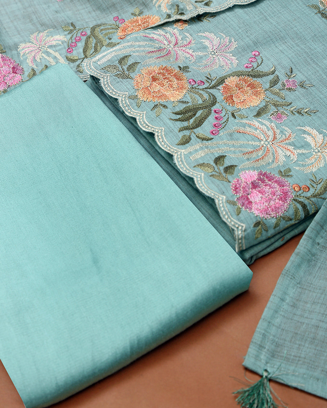Sea Green Floral Embroidered Khiccha Cotton Unstitched Dress Material Suit
