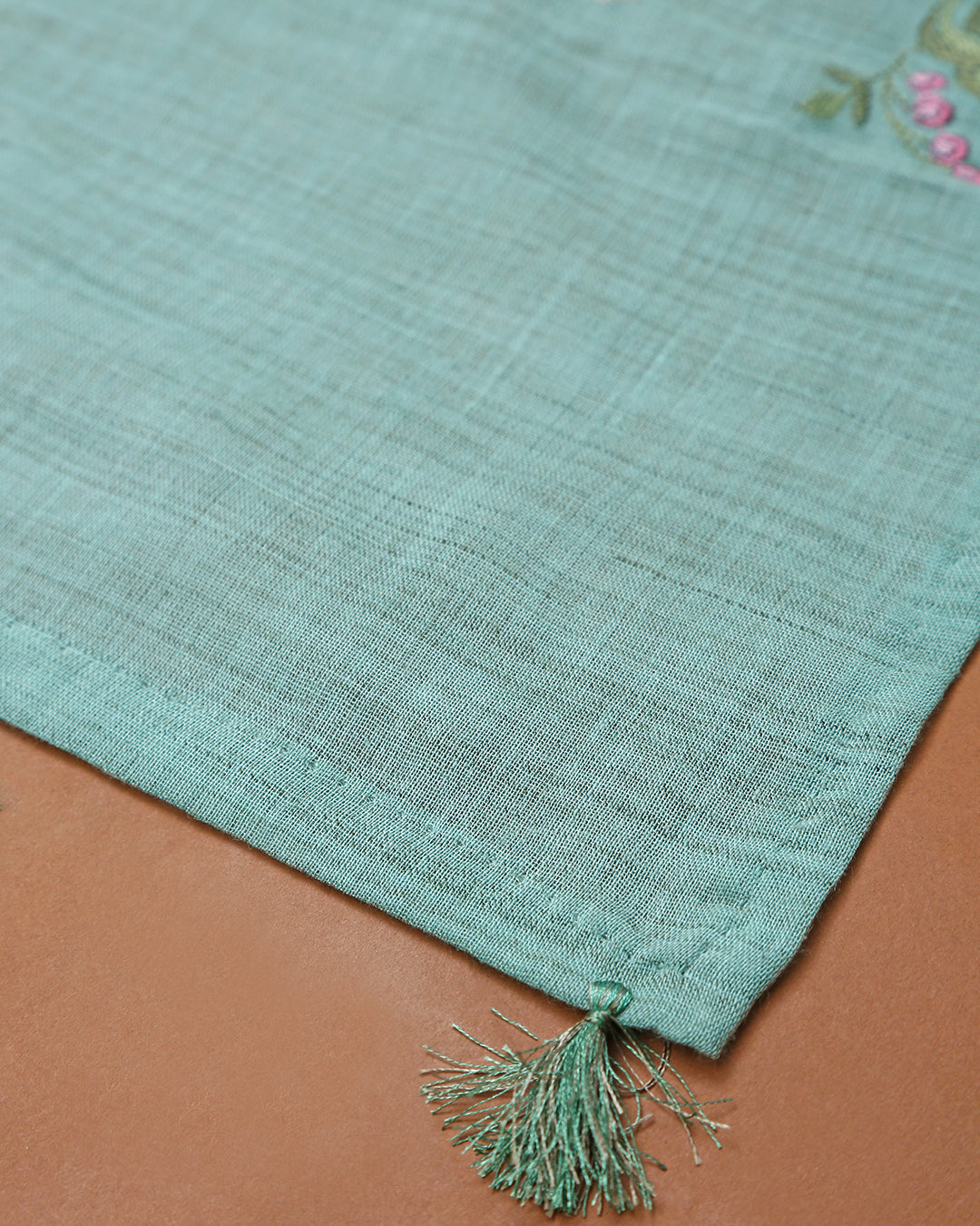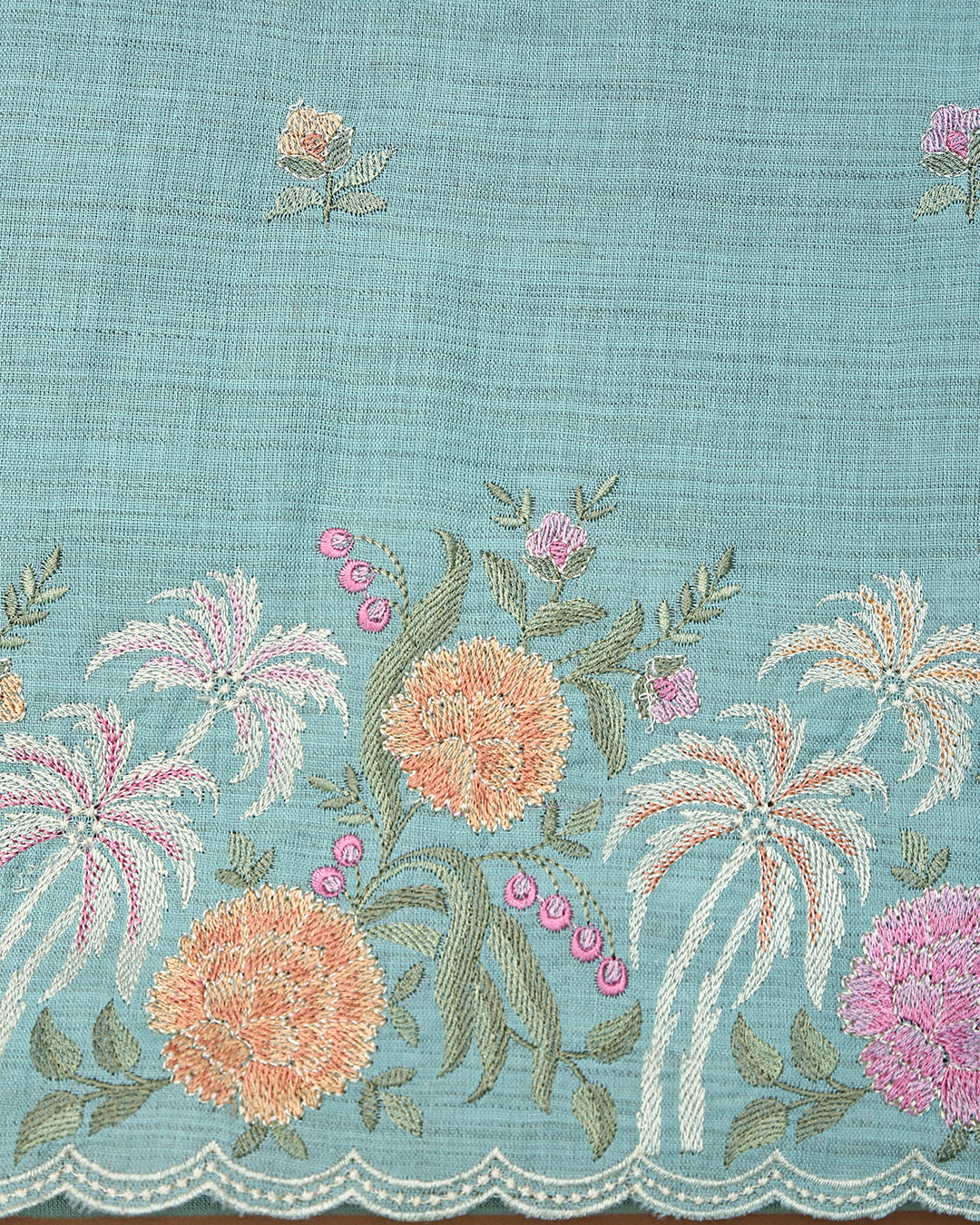 Embrace the breezy elegance of Khiccha cotton with this enchanting unstitched suit set. The serene sea green fabric is the perfect canvas for a vibrant display of floral embroidery. Intricate flowers in shades of peach, pink, and green bloom across the kurta material, creating a captivating and feminine design. The delicately scalloped edge of the kurta fabric adds a touch of refined detail.