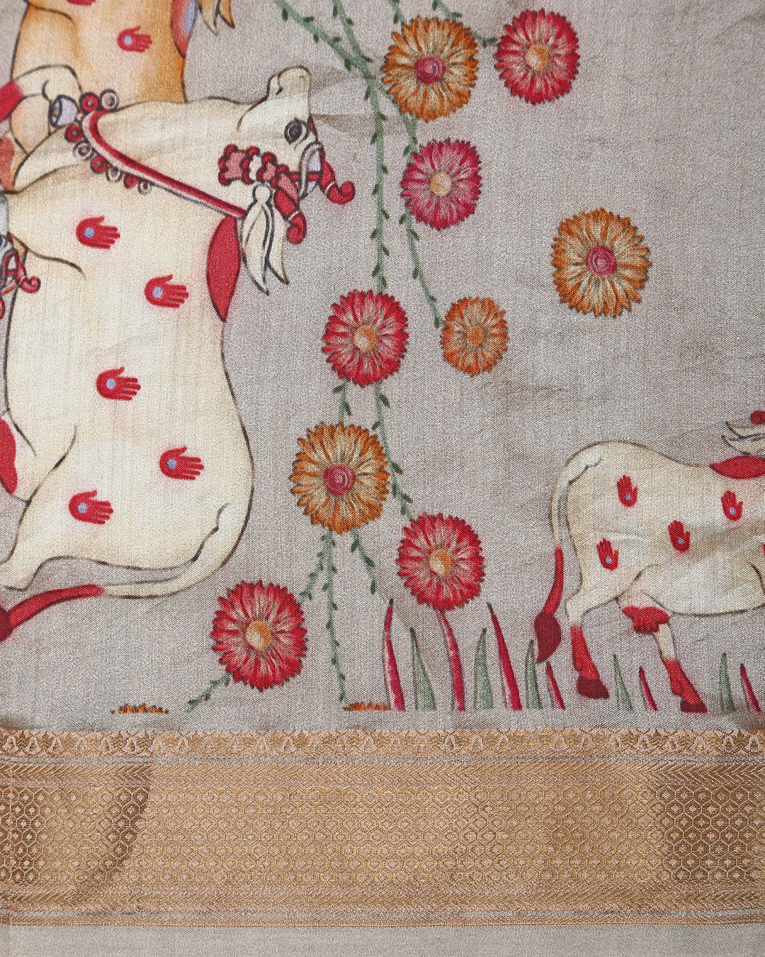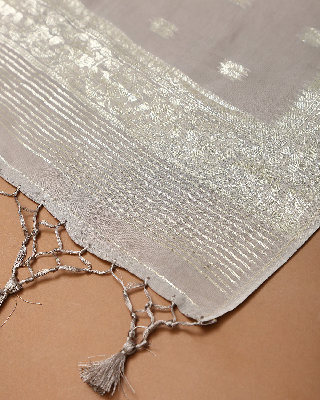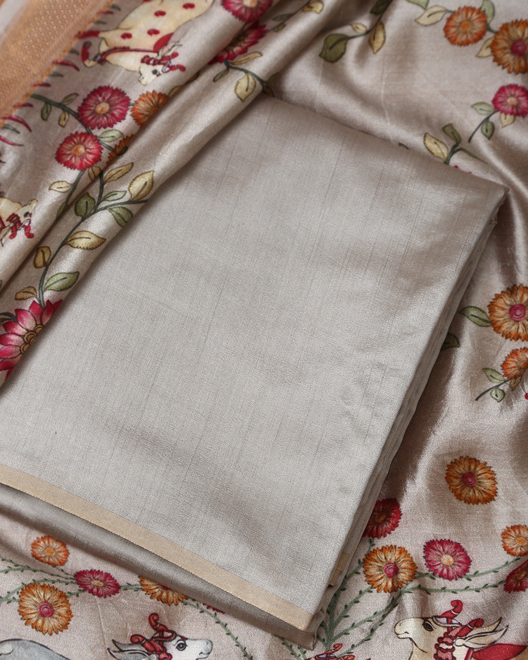 Embrace understated elegance with our Silver Mist suit set. Crafted from luxurious Chiniya silk, this unstitched ensemble features a soft, silvery-grey hue with a beautiful sheen. The set includes a coordinating printed dupatta, adding a touch of vibrant artistry with its traditional Pichwai-inspired design. Create a custom-tailored outfit that is both sophisticated and comfortable.